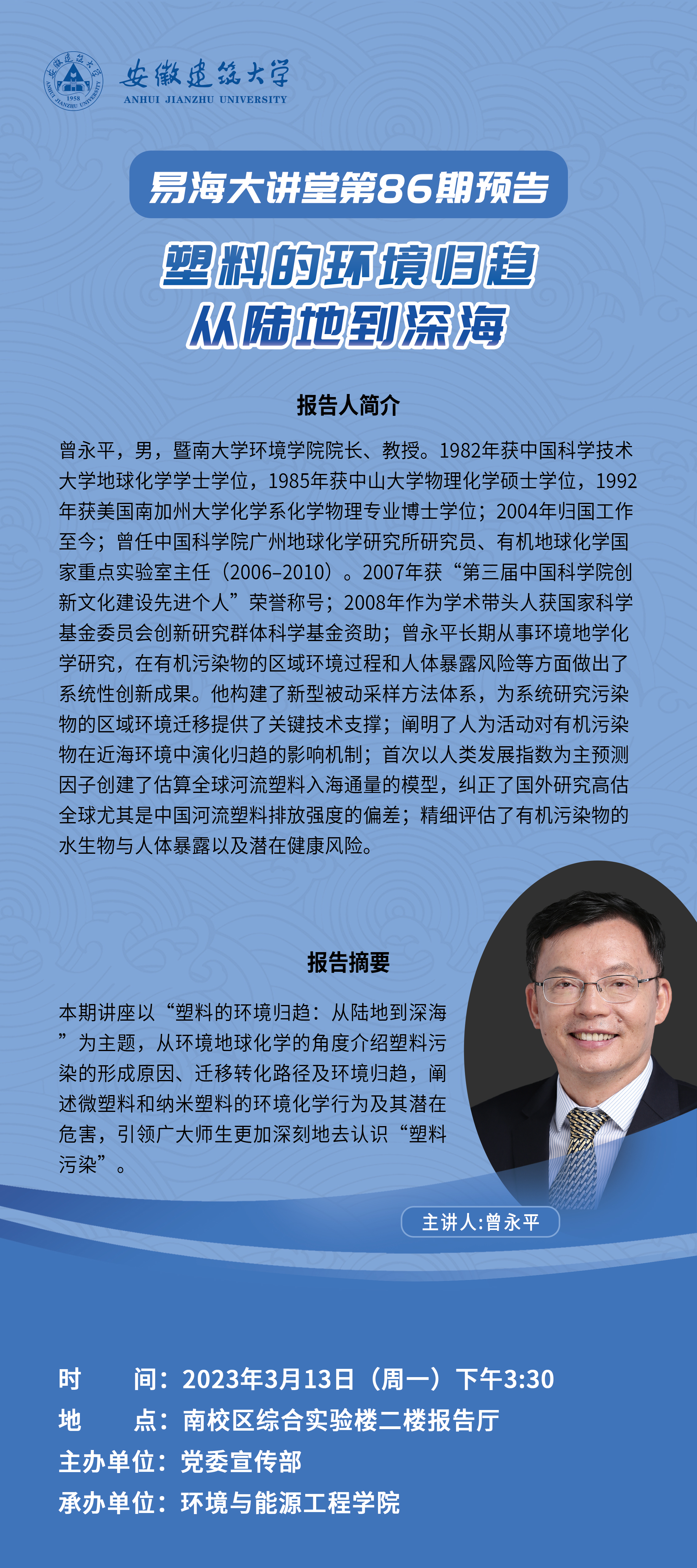 曾永平,暨南大学环境学院院长、教授。1982年获中国科学技术大学地球化学学士学位,1985年获中山大学物理化学硕士学位,1992年获美国南加州大学化学系化学物理专业博士学位,2004年归国工作至今;曾任中国科学院广州地球化学研究所研究员、有机地球化学国家重点实验室主任(2006–2010)。2007年获“第三届中国科学院创新文化建设先进个人”荣誉称号;2008年作为学术带头人获国家科学基金委员会创新研究群体科学基金资助;曾永平长期从事环境地学化学研究,在有机污染物的区域环境过程和人体暴露风险等方面做出了系统性创新成果。他构建了新型被动采样方法体系,为系统研究污染物的区域环境迁移提供了关键技术支撑;阐明了人为活动对有机污染物在近海环境中演化归趋的影响机制;首次以人类发展指数为主预测因子创建了估算全球河流塑料入海通量的模型,纠正了国外研究高估全球尤其是中国河流塑料排放强度的偏差;精细评估了有机污染物的水生物与人体暴露以及潜在健康风险。