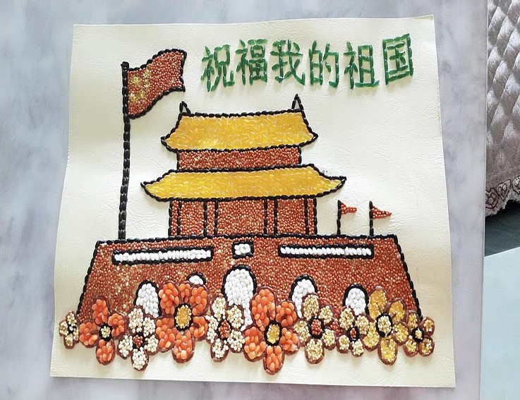 19级公共艺术专业沈怡雯创作的《珍惜》用谷物和石头做出天安门的形象,展示祖国底蕴丰厚、历史悠久、繁荣强大,提醒我们珍惜现在来之不易的幸福生活,致敬那些在背后为我们付出的逆行者们。