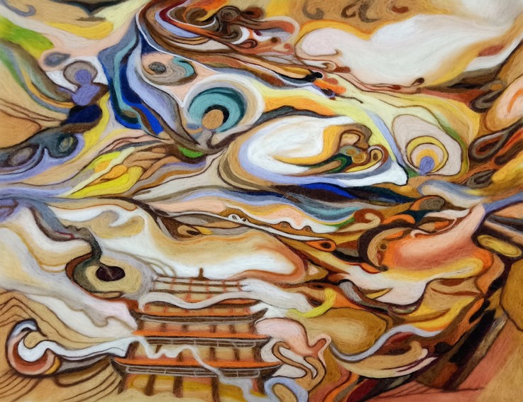 18级视觉传达设计专业王妍采用羊毛毡创作的的作品《众志成城齐翩跹》展示了新冠疫情以来,全国上下齐心协力、众志成城的场面。沧海横流,众人不惧风雨,与时间赛跑,同病毒较量,尽显英雄本色。