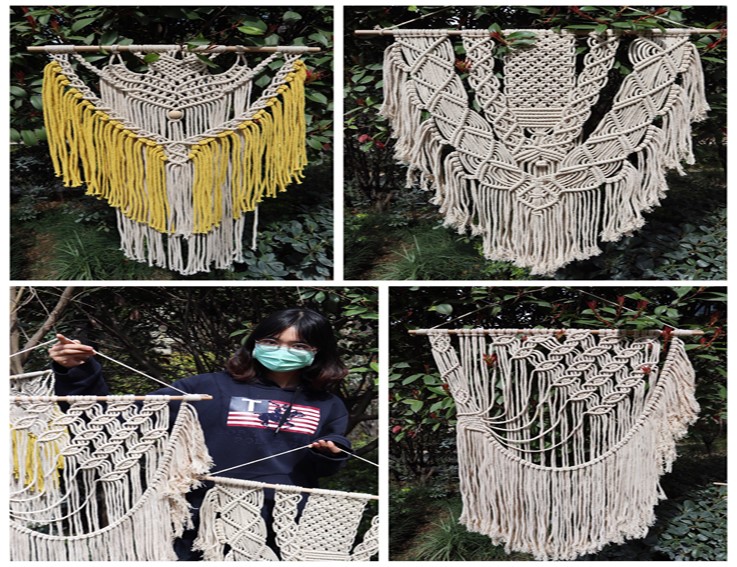 18级环境设计专业张艺馨采用中国传统手工技艺——绳编创作的作品《“连结”生命,爱满人间》用一个个凝结的绳结拟作点点滴滴的祝福与希翼,汇聚成为黑夜里的光,连结一个又一个生命,给予“最美逆行者”丝丝温暖和前行的力量,表达对在战“疫”一线医护者们的赞美与歌颂。