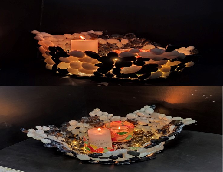 18级视觉传达设计专业董美萱采用鹅卵石、玻璃和蜡烛创作《祈愿平安》,黑白鹅卵石相互交错代表着医生同新型冠状病毒不断抗争,代表了对所有前线工作者以及患者们的平安祈愿和无声支持。
