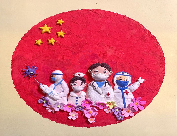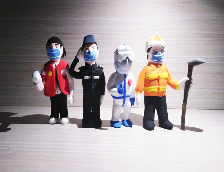 18级视觉传达设计专业陈敏采用超轻粘土创作的《战疫者联盟》展现了伟大的医务人员、人民警察、消防军人以及千千万万的人民志愿者们组成的庞大的“战疫者联盟”在这场看不见硝烟的战争中可爱又可敬的一面。