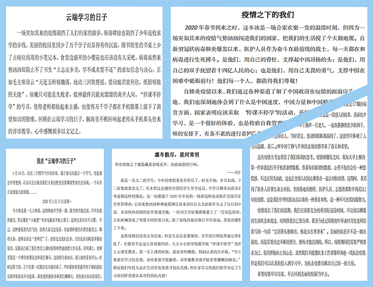学院对作品进行初审后筛选出20件作品进行展示。这些作品以日记、诗歌、散文等形式,讲述了学生们居家云端学习的心得感悟,一张照片、一个瞬间、一段故事汇聚成一股股力量,给大家带来温暖与希望。