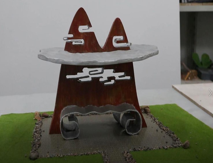 图中雕塑作品是一座休息亭,它有着高耸入云的奇峰和宛若玉带的大江作为主体,有着碧波万顷的湖泊作为顶盖,也有着令人称异的云海点缀其中,一如祖国的大好风光。正值祖国母亲华诞之时,憩于此亭中,仿佛博览群山大川,不亦乐乎。