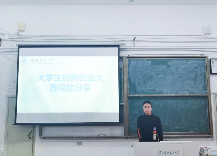 此次讲座邀请几位高年级学生传经送宝,他们多次获得创新创业各类比赛奖项,为低年级学生介绍创新创业类比赛的基本情况,分享参加比赛的经验。18级公共艺术专业的肖盛同学,获得2020年度安徽省十佳大学生创新创业类提名,成立了自己的公司,他从“为什么”、“怎么做”、“做在哪”等三个方面,讲解关于创新创业比赛的策划内容;18级视觉传达专业的王云虎同学通过观看视频和讲解策划书案例,详尽列出各类赛事与参赛流程;19级环境设计专业的苏怡航同学,分享自己参赛的经历与收获,鼓励大家积极参加大学生创新创业类的比赛。