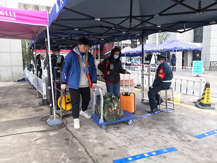 3月2日,艺术学院组织学生志愿者来到学校大门口帮助同学们搬运行李,迎接大家返校。