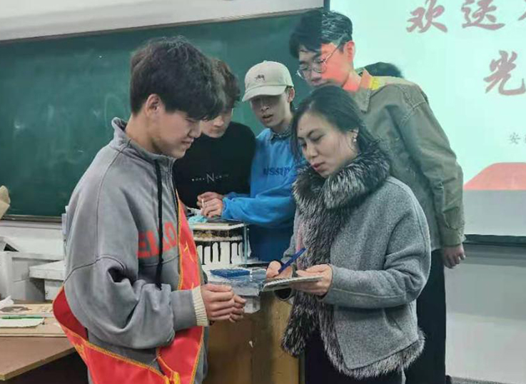 欢送会上,即将奔赴军营的两位同学抑制不住激动的心情,表达了对母校、对老师和同学的感谢和依依不舍。对于2017级毕业班来说,还有3个月即将毕业奔赴工作岗位,开启人生新的篇章。那时,范良源同学身在军营,无法和相处四年的兄弟姐妹们挥手告别,大家格外珍惜此次相聚的时刻,心中无比留念和不舍。2020级新生班级亦是如此,虽然相识半载,朝夕相处间感情早已深厚,同学们为乔龙帅同学送上了祝福贺卡,表达内心最真挚的情感。