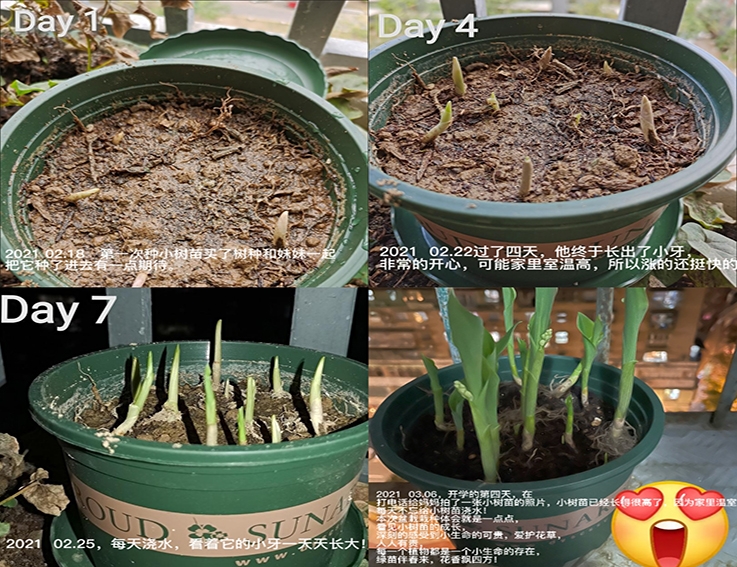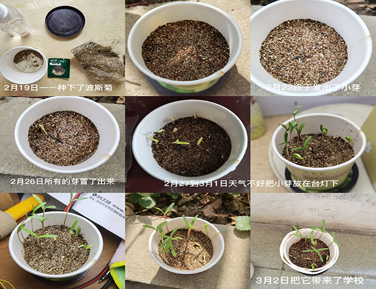 活动以种植培育、观察记录和感悟心得为主,以照片和文字形式记录,同学们通过亲手播种、埋土、浇水等种植过程,对生命力的敬佩与对爱绿护绿的责任感由心而生。有同学在育苗心得中写到:“亲眼看到一份份绿色生命破土而出、茁壮成长,不仅从中感受到了盎然之春,还领悟到了生命的力量、成长的希望”。同学们表示,新学期要努力做向上生长、生机勃勃的春苗,期待茁壮成长、盛开绽放的那一天。