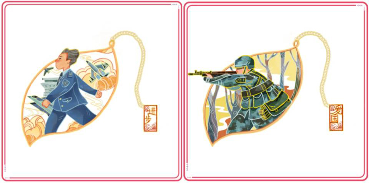 19级公共艺术专业张若彤设计的书签以树叶作为整体造型,以合金为主要材质,刻画戍守边疆战士的不同侧面,突出边防战士的爱国情怀。书签用烤漆和填彩工艺构成,同时仿造叶脉的造型设计链条吊坠,更好地提升书签本身的易用性,美化书签的整体外观。