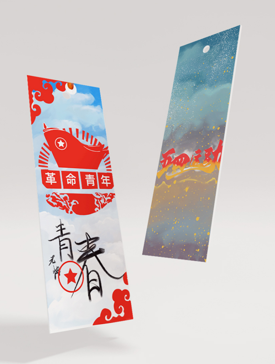 19级环境设计专业郑新丽设计的书签,以朝气蓬勃的青年为画面主体。时光变换了青年的面孔,但不变的是青年对梦想的追逐、对国家的热爱,激励着一代代青年弘扬“五四精神”,创造属于自己的青春。