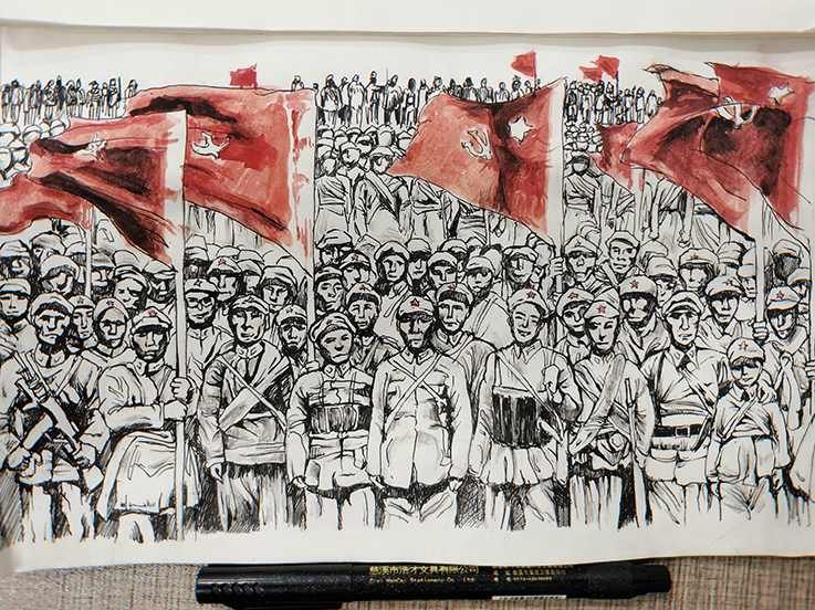 20级环境设计中外合作专业周雅静通过阅读《苦难辉煌》一书,参考《中国工农红军长征胜利七十周年》邮票,绘制素描作品《长征》。长征,是一部中国工农红军艰苦卓绝的战争史书,更是一座中国革命史上的不朽丰碑。长征历经两年,红军一共转战十四个省,全程两万五千里,击溃国民党军数百个团,最终获得了胜利。鲜红的旗帜如烈火般飘扬,坚定的信念传承至今。