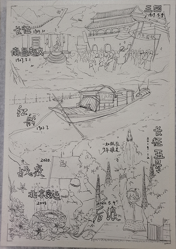 20级公共艺术专业谢玄玥阅读《中国共产党历史》一书后,以线条的方式勾勒画作《回望红船》。一叶红船,见证了中国历史上开天辟地的大事变,成为中国革命源头的象征。从此,中国共产党引领革命的航船,劈波斩浪。百年风华,红船精神昭示着永不褪色的精神丰碑。