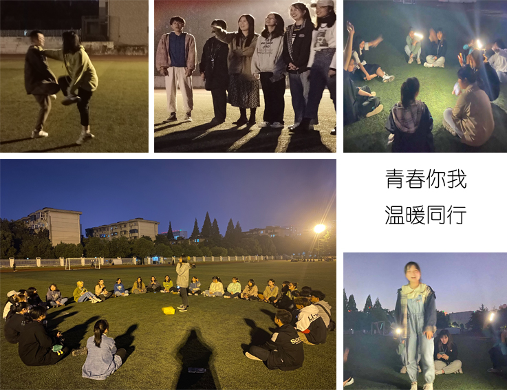20级环境设计中外班采取户外游戏的方式开展心理团辅活动,在操场昏黄夜灯下同学们围聚在一起,于欢声笑语中拉近彼此间的距离,舒缓负面情绪。