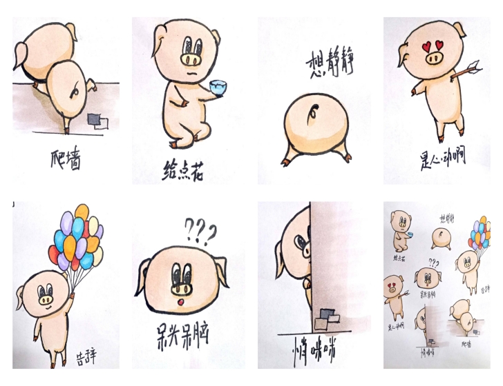 19级环境设计专业安稳通过手绘的形式创作的表情包《猪猪养成记》,以“青春”为主题,用猪猪生动可爱的表情表达大学生的生活状态。