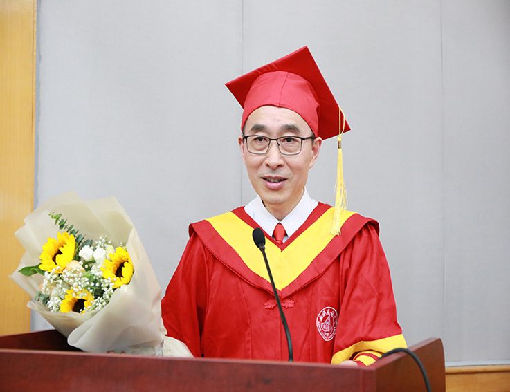 成祖德代表全校教职工向圆满完成学业的同学们表达了热烈的祝贺,鼓励同学们发扬攻坚克难的精神,锐意进取,砥砺奋进,发扬开拓创新的精神,激扬“敢为天下先”的豪情,为中国的强大贡献更多的创新支持,表达母校和老师对毕业生衷心的祝福和美好期望。
