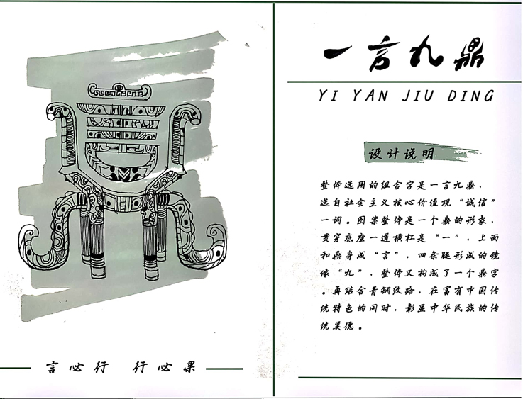19级视觉传达专业许纪洲的作品《一言九鼎》,将四个汉字重新排列组合成“鼎”,表达社会主义核心价值观“诚信”理念,以象形的艺术手法传达中华民族的传统美德。