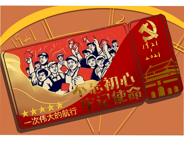 20级环境设计专业黄艺雯创作了一张1921驶向2021的车票,以红色为主色调,画面中心是代表革命胜利的工人群众振臂欢呼,将百年的征途浓缩在这一趟车次之中,让“不忘初心,牢记使命”成为推动广大青年为历史使命与历史重任不懈奋斗的精神动力。