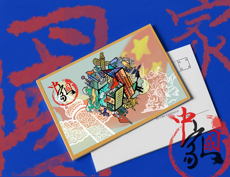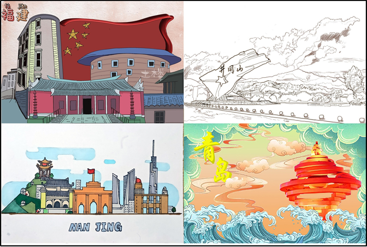 21级的席悦、刘薇薇、刘熙睿和许烨同学分别以自己家乡的地标性建筑为设计元素,创作了各具地方特色的明信片作品。福建土楼见证了中国人民百年来的风风雨雨;井冈山的千峰万仞下革命的旗帜猎猎作响;屹立于青岛的五月之风雕塑静静诉说着新民主主义的激昂呼号。