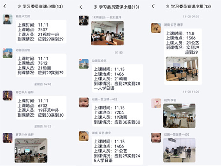 为营造勤学善思的学习氛围、突出课堂教学的重要性,艺术学院成立查课小组,由各班学习委员在群内汇报班级出勤情况,并由辅导员不定时查课、听课,与迟到、旷课学生进行谈心谈话。学生课堂听课效率和学生学习热情显著提高,迟到、早退、旷课等现象明显减少。院学生会负责晚自习考勤工作,引导大一学生树立正确的学习态度,培养良好的学习习惯。