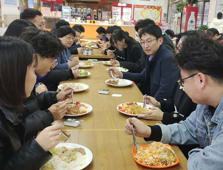在食堂,艺术学院同学们纷纷围坐过来,和校领导畅所欲言。张亚新认真询问了同学们对食堂的意见和建议,包括对菜品口味的要求、营养是否均衡、少数民族同学的用餐体验等等,并鼓励同学们要在学习之余坚持锻炼身体,保持健康的体魄与积极向上的心态,乐观面对生活学习中的压力和困难,并与同学们分享了自己在体育锻炼方面的心得体会,号召大家用各种方式积极锻炼身体,为自己打造更加充实的校园生活。