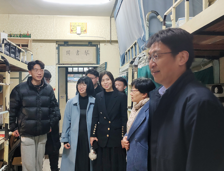 在走访宿舍中,张亚新与学生们亲切交谈,深入了解同学们在搬迁到南校区后的生活情况,了解同学们对宿舍管理等方面的需求。看到同学们正在电脑上绘制专业课作业,张亚新与同学们探讨学习压力与考研方向等相关话题,表示艺术学院的专业课程对学生的要求越来越高,希望同学们能够努力提升自己,为自己创造更加美好的未来。张亚新对艺术学院同学们的宿舍内装饰给予肯定,指出生活之中应当有一双发现美的眼睛,唯有懂得如何发现美,才能够去创造美,成为一名优秀的艺术学院学生。
