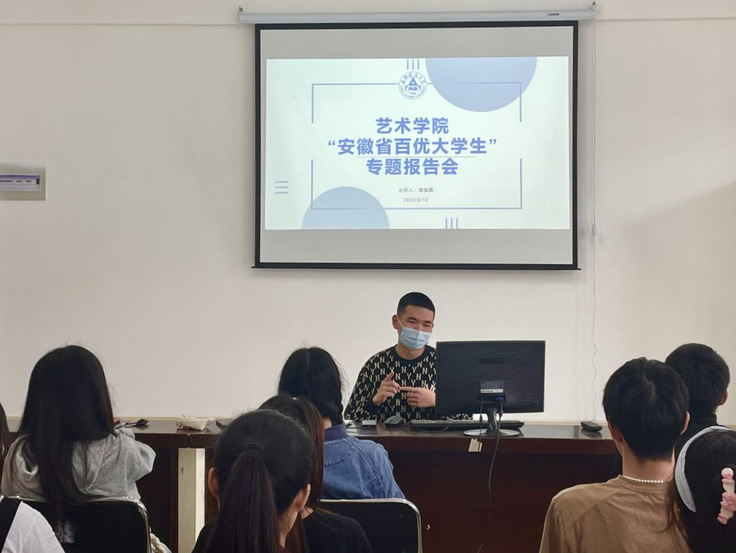 本网讯 近日,由团省委、省委宣传部、省文明办、省教育厅等单位联合开展的安徽省“‘十佳’‘百优’大学生”选树工作结果揭晓,艺术学院2019级公共艺术专业曹逸磊同学荣获2021年度自强奋斗类“安徽省百优大学生”称号。为树立先进典型,弘扬奋斗精神,传递青春能量,艺术学院举办“安徽省百优大学生”专题报告会。