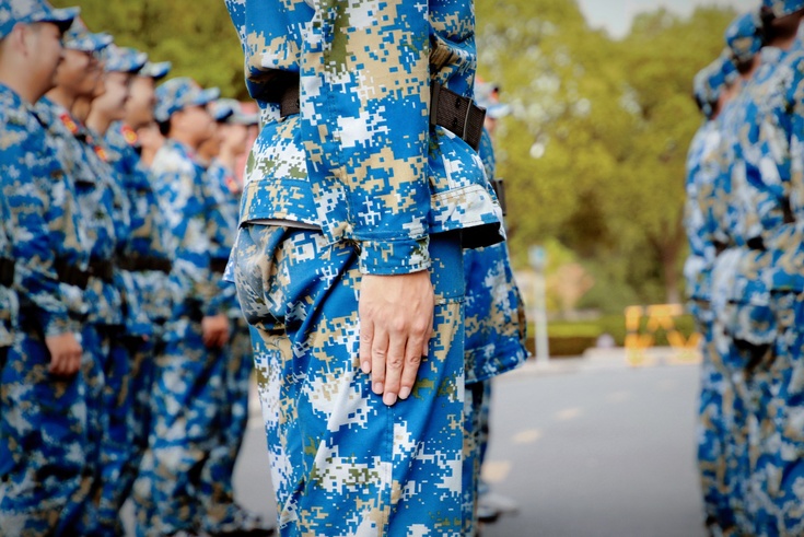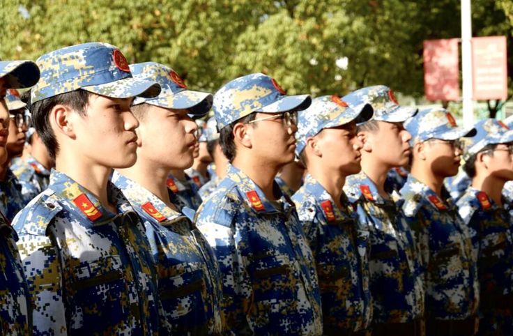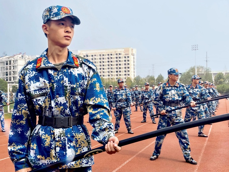 朝阳晕染天边,碧水绿树环绕校园,微风裹挟着几缕炽热,军装点染坚定的面庞,钢铁意志铸炼军人情怀。