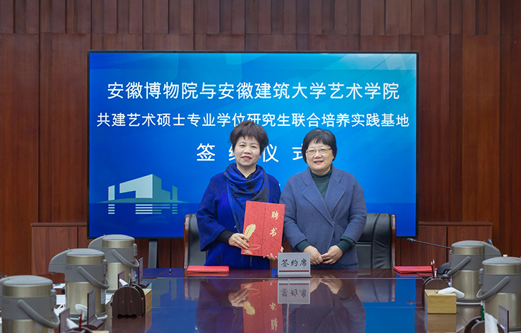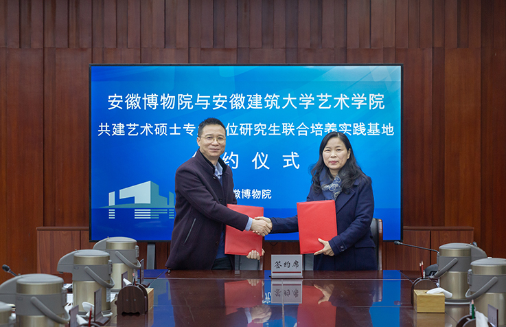 本网讯 2月23日上午,艺术学院与安徽博物院签订研究生联合培养实践基地协议,签约仪式在安徽博物院(新馆)新安江厅举行,安徽博物院党委书记、院长雷修佛、副院长徐大珍、副院长郑道春、艺术学院党委副书记潘青、副院长邢瑜、展示与合作部主任刘雪丹、非物质文化遗产保护传承创新团队负责人陈治军老师及部分艺术硕士专业学位研究生出席仪式。