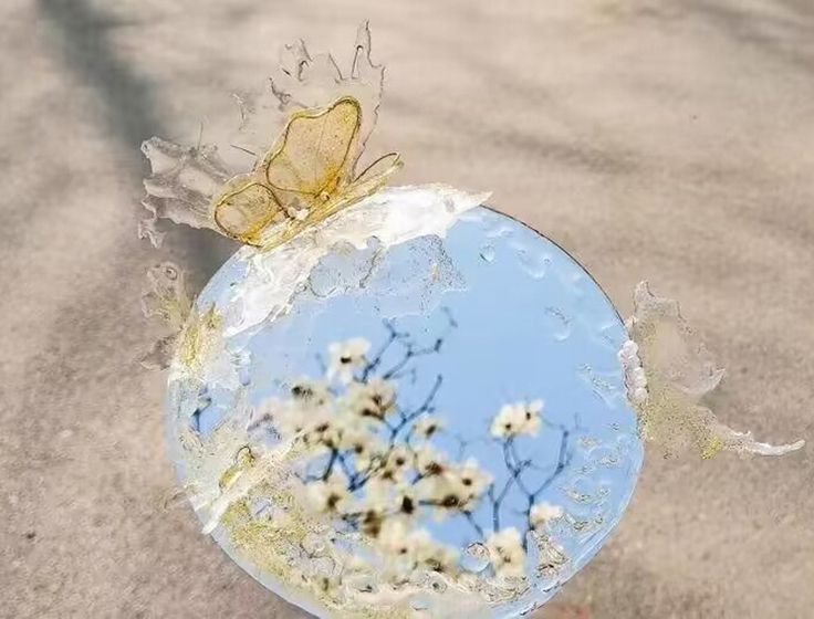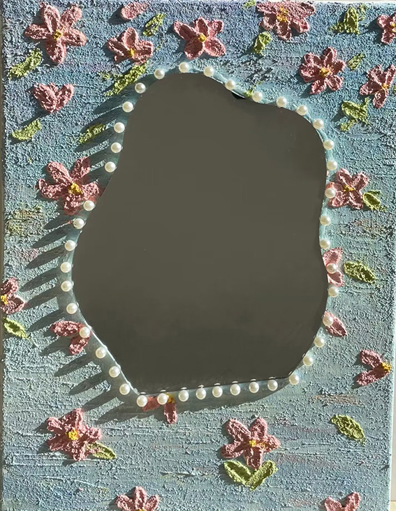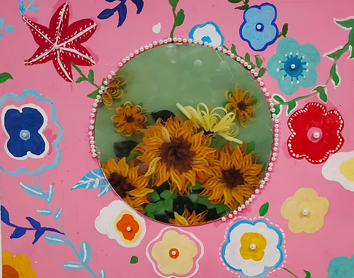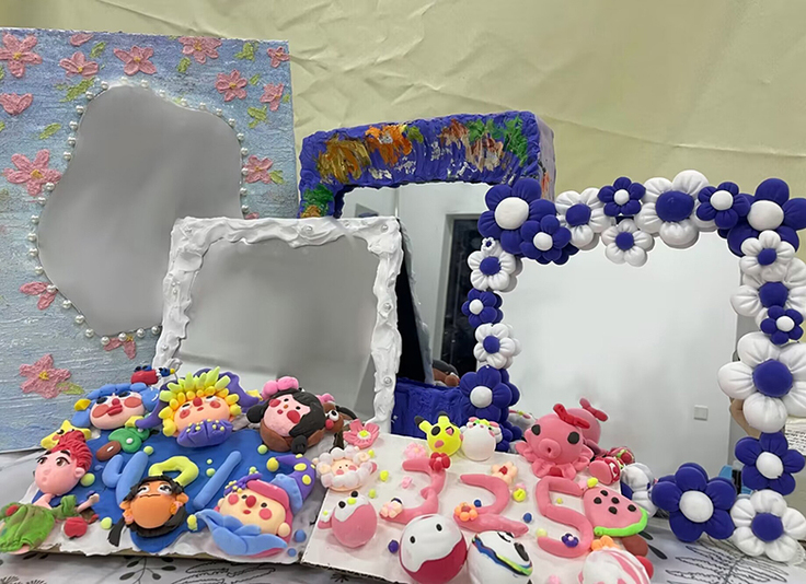 各寝室充分发挥想象力与创新精神,将传统创作技法与独特创意相结合,以日常生活中常见常用的“镜子”为创作主体,通过各种不同的元素附加与外观改造,将一面面普通的镜子打造成了一件件精致的艺术品,石英砂画镜、浮雕粘贴镜框、克兰因蓝花朵装饰等展现出独特的创意形式。