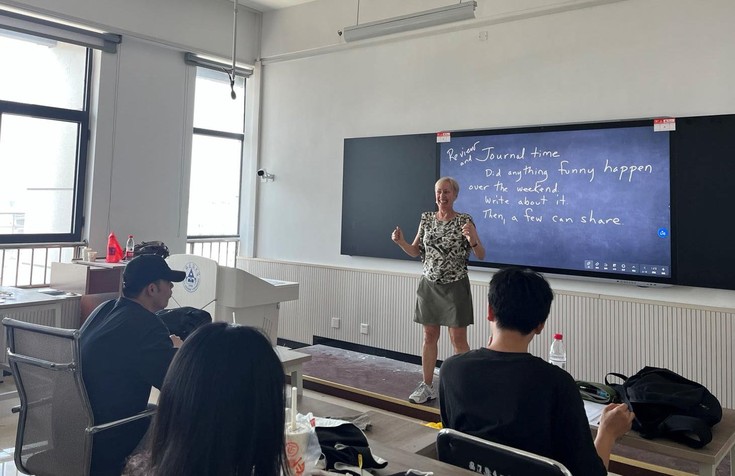 Cara Fulton老师来自美国,曾在多所美国名校任教,积累了丰富的英语教学经验。自2020年以来,已连续三年为环境设计中外合作办学项目的学生教授《国际学生的美国语言》课程。5月9日上午,Fulton老师来到实训综合楼6705教室,开始第一次在教室里给同学们现场上课。尽管刚开始同学们表示难以适应全英文的课堂语言环境,但老师积极饱满的教学态度、幽默风趣的开场白以及高度个性化的反馈让同学们提高了学习英语、运用英语的兴趣和自信心。