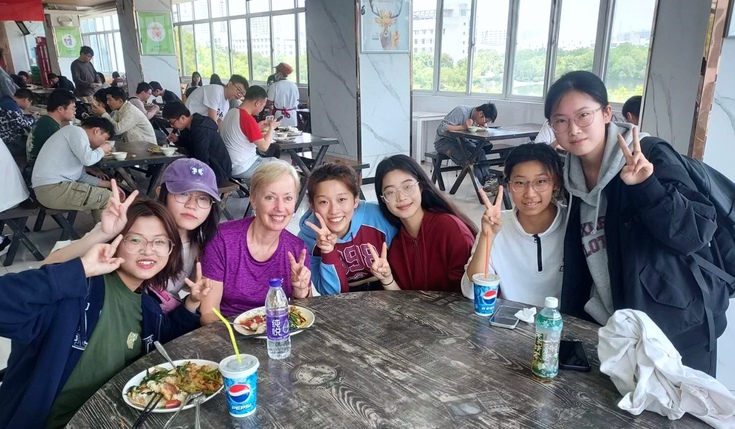 课余时间,Fulton老师和同学们一起探索食堂的特色美食,她也喜欢和大家切磋乒乓球,或是在羽毛球馆挥洒汗水。周末时,Fulton老师在我院师生的陪伴下游览了包公祠、天鹅湖、明珠广场、合肥市野生动物园等市内热门景点。她还慕名前往黄山、桐城,在奇松怪石、云雾缭绕间体会“天下第一奇山”的壮美瑰丽,在六尺巷中感受中国人对谦和与礼让的传承。