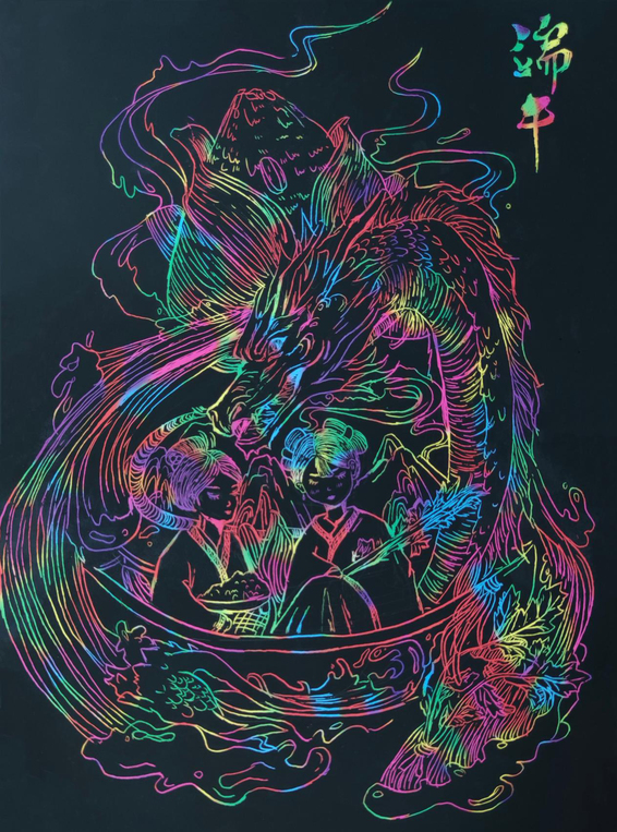 20级环境设计专业杨贤浩刮画作品《“粽”得功成》以龙舟为主要元素,将粽子作为点缀其中,缤纷的波浪与高山、青荷、野鹤、绿叶相融合,通过缤纷绚丽的色彩构成效果,将端午节的构成元素与文化内涵生动地表达了出来。