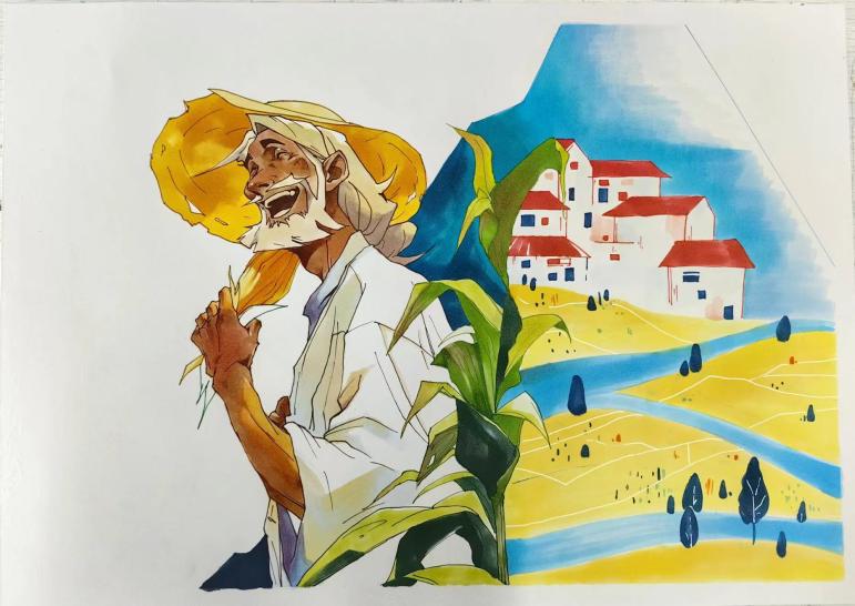 23视传1班何佳美的作品《“农”墨重彩绘乡村》,以黄色和绿色为基调,画面上一位农民手持稻穗、笑容满面,纵横交错的水路、错落有致的房屋,生动描绘了人与乡村自然和谐共生的美好景象。
