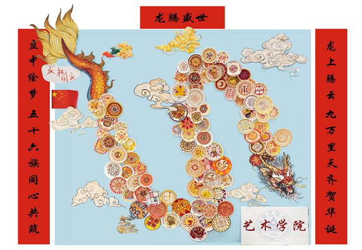 本网讯 金秋十月,为庆祝中华人民共和国75周年华诞,艺术学院百名同学共同创作了汇聚56个民族传统纹样特征的中国龙艺术作品。
