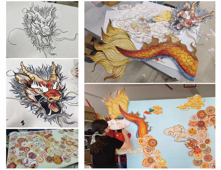 腾飞在天空中、祥云环绕的中国龙由百余个大小不一的盘子组成,每个盘子上绘制了代表中国56个民族特色的纹样,如布依族团花纹、侗族太阳纹、傈僳族几何纹等,象征着中华民族的团结和昌盛。民族纹样作为民族文化的重要组成部分,承载了丰富多彩的民族感情和精神追求。在老师的指导下,同学们认真研究探文化、精心设计展奇思、悉心创作现妙想、携手共抒爱国情,反复的推敲每一个盘子的绘制,力求准确呈现每一个民族的独特文化元素。