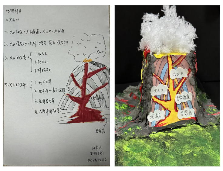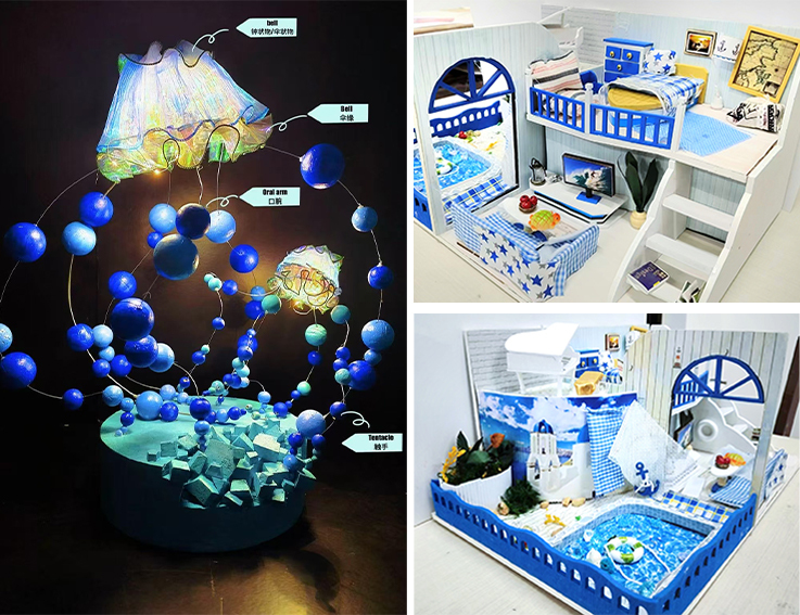 “多维解构 创艺赋能”立体模型创作活动亮点纷呈。同学们勇于突破二维局限,将教材中抽象晦涩的理论概念转化为可触可感的立体化作品。他们利用纸板、黏土、织物等日常媒材,通过拼贴、雕刻、组合等精湛工艺,创新构建出充满想象力的空间形态。尤为可贵的是,每件作品辅以专业精准的知识点备注卡片,实现了艺术创作与知识传递的自然融合,让观众在审美体验中感悟艺术魅力。