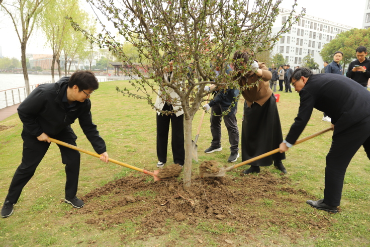 植树现场,党员们分工协作,挥锹铲土、扶苗填坑、培土浇水,干劲十足。经过大家的辛勤劳作,栽种的10棵海棠树在校园里安家落户,每一棵树苗不仅寄托着大家对绿色校园的美好期望,也为校园增添了一抹新绿。